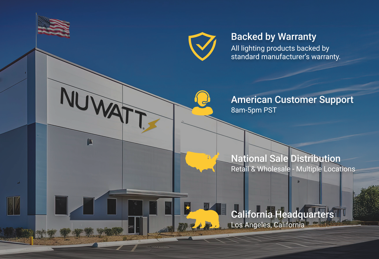 The NuWatt commitment to quality runs deep within our entire catalog. Each LED light we produce is rigorously tested to meet UL, ETL, FCC, and RoHS safety standards. When it comes to performance, our lights meet and often even exceed efficiency requirements set by DLC, Energy Star, and California JA-8 Title 24 and Title 20. In short, you aren’t just buying any light; you're buying NuWatt.