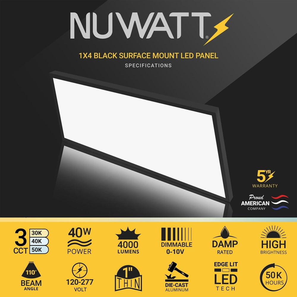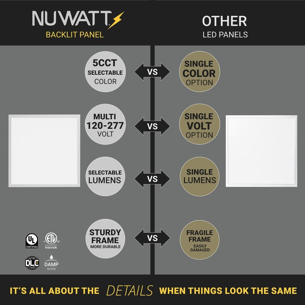 NuWatt offers a wide variety of flat LED panel ceiling light fixture options, including the popular 2x2 LED flat panel and 2x4 LED flat panel sizes as well as 1x4, 2x4 and 1x1. With over 20 LED panel lighting fixtures to choose from, you are sure to get the right one, so whether your need a 2 x 4 LED flat panel with extra brightness for drop ceiling lighting of an office, or square 2 x 2 LED flat panel flush mount ceiling lights, you can find what you need with NuWatt. Adding style to functionality, NuWattLED flat panel lighting is available in black trim, and selectable color temperatures, so you can set the right ambiance for any space.