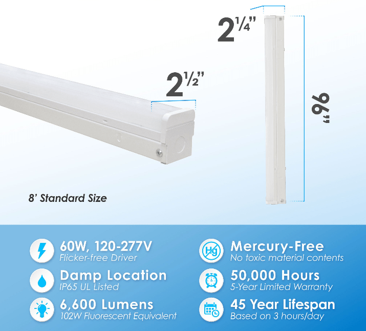 The NuWatt line of top rated led shop lights offers exceptional versatility, advanced features, and certified quality. From our bestselling 4 foot LED shop lights to our 2 foot and 8 foot LED shop lights, every garage ceiling light we sell can be surface mounted or suspended. NuWatt LED strip ceiling lights also offer selectable color temperatures, including 3000K Warm White, 4000K Cool White and 5000K Daylight, as well as selectable wattage and dimmability for precise brightness control. With universal 120–277V capability, NuWatt LED garage ceiling lights can be used in both residential and commercial settings. Our feature packed garage LED strip lights come with motion and photocell sensors, as well as emergency battery backups in select models, providing crucial safety in work environments. JA8 and Energy Star certified for efficiency, and DLC and UL rated, these LED garage strip lights meet rigorous standards for safety, performance, and eligibility for energy rebates.