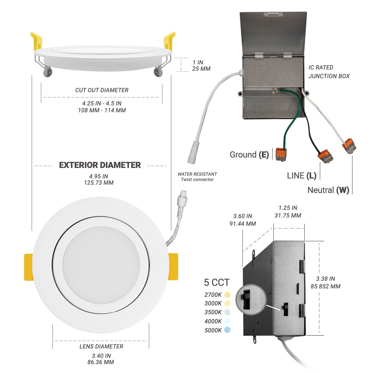 Switch Between 5 Color Temperatures — Slide the 5 CCT dip switch on the junction box to set the color temperature on our gimbal LED recessed light. Five selectable option range from warm to cool shades of white light. Set to one of the following options, Soft White 2700K, Warm White 3000K, Neutral White 3500K, Cool White 4000K, and Daylight 5000K.