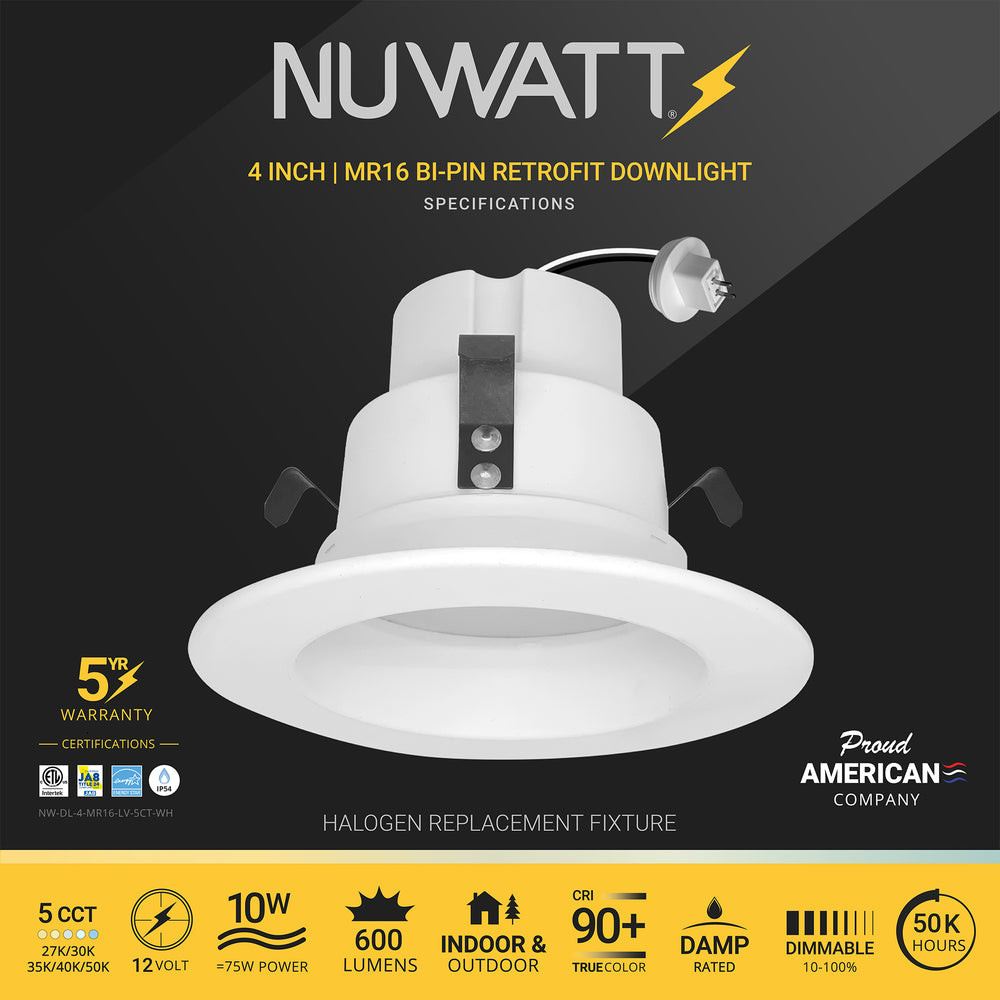 - 12 Volt Lighting: NuWatt 12V Low Voltage Recessed Light with GU5.3 Bi-Pin base operates at 10 Watts with a luminous flux of 600 while connected to a 12 volt line. Our 4 inch aluminum light provides efficient and focused illumination for various lighting applications. Well-suited for a range of residential and commercial applications, from kitchens and living spaces to retail displays.