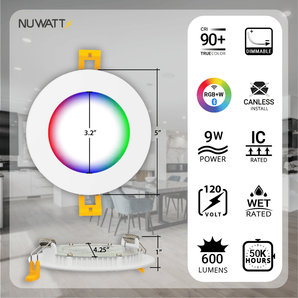 Smart Recessed Lighting: The NuWatt 4 inch smart downlight is red, green, blue, and white spectrum for a combination of 16 million different colors selectable through our app. It also gives you the power to select anywhere from 2700K to 6000K.