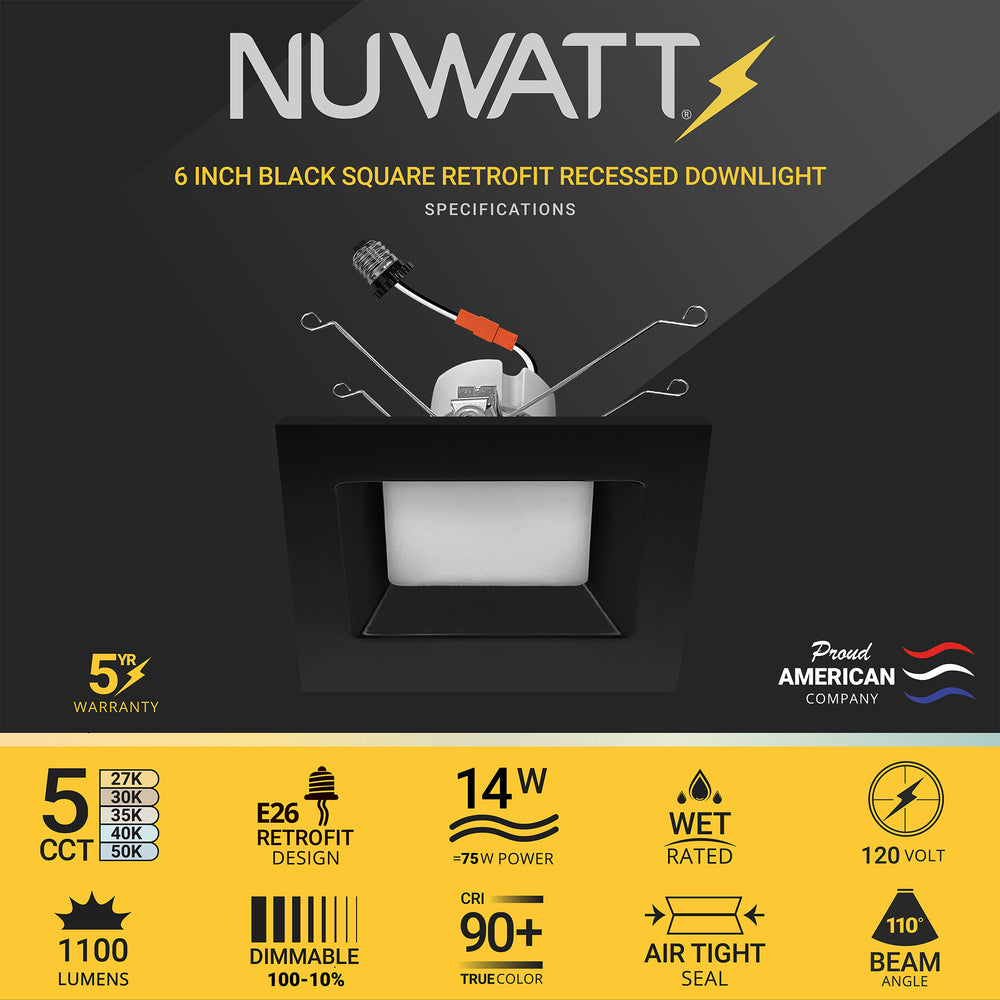High Definition Color Rendering (CRI 90) — NuWatt high CRI square LED pot lights offer exceptional color accuracy and clarity, so objects, skin tones, clothes, and food appear more vibrant.