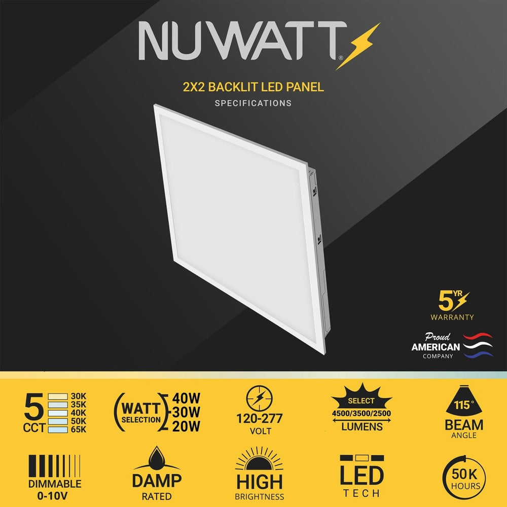 - Selectable Lumen Output: Experience unparalleled lighting flexibility with the NuWatt drop-in panel. The 2x2 LED flat panel light allows you to adjust the luminosity from 2500LM to 3500LM up to a Super Bright 4400LM providing the optimal brightness level for any setting—be it residential, commercial, or industrial.